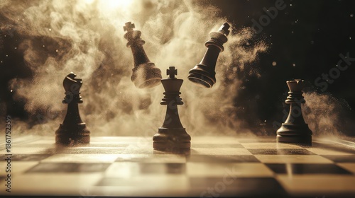 Flying chess pieces exploding from a board as dust erupts frozen midair cinematic lighting dramatic motion hyperrealistic detail