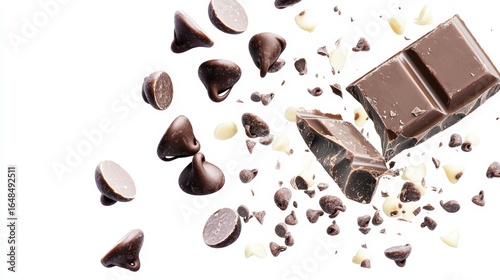 Flying chocolate chips against a bright white background, dynamic and commercial poster-style product photography