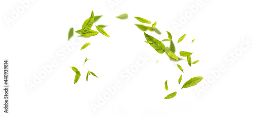 Flying leaves of green mint leaves falling in the air on white background. Food levitation concept