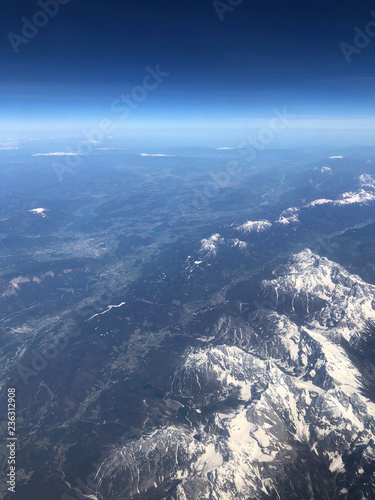 Flying over the snowy alps in Europe