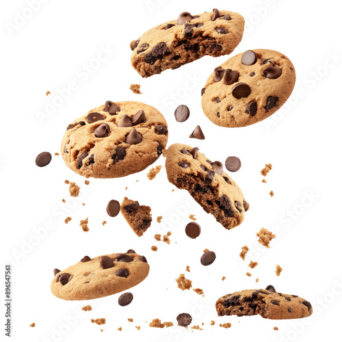 Flying pile cake crumbs chocolate chip cookies isolated on transparent white background, clipping path