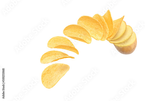Flying potato chips, isolated on white background.