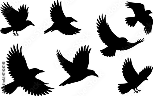 "Flying Raven and Crow Silhouettes Collection" "Bird Flock Silhouette Set – Ravens & Crows" "Dark Bird Flight Silhouette Vector Pack"