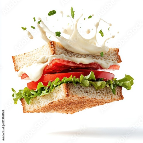 Flying sandwich with creamy mayo splashes creating contrast, isolated on a white background