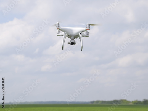 Flying white quadrocopters over a field of wheat