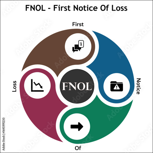 FNOL - First Notice Of Loss acronym. Infographic template with icons and description placeholder
