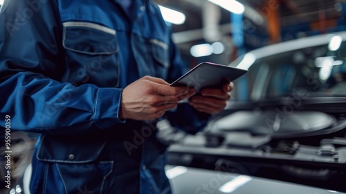 Focus on male auto mechanic in uniform using digital tablet while standing and checking engine in car service center.