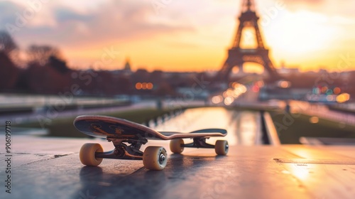 Focus on skateboard background, blurred Eiffel Tower, Paris