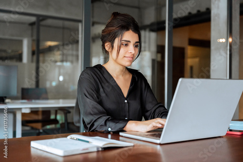 Focused 30s latin hispanic middle-aged business woman working on laptop computer in modern office. Indian young businesswoman professional employee using pc doing online banking analysing at workplace