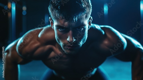 Focused athlete demonstrating push-up technique in a gym setting during evening workout