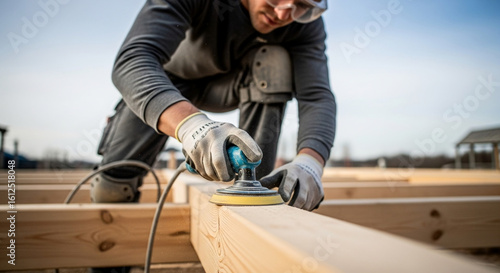 Focused Carpenter Smoothing Wood Beam with Precision Sander for Flawless Construction, Emphasizing Safety with Protective Gear