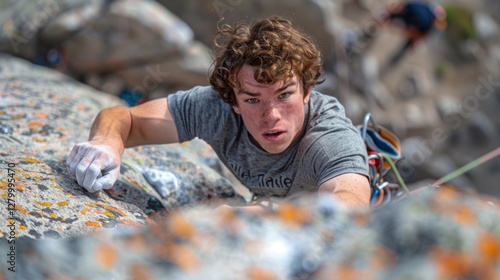 Focused climber scales a rugged cliff, showcasing strength and skill while navigating vibrant, lichen covered rock during bright daylight.