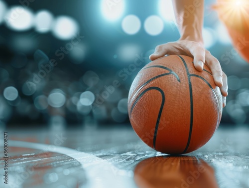 Focused close-up of a basketball player's hands dribbling, showcasing footwork and control, embodying the spirit of Olympic sportsmanship and finesse, ball in play