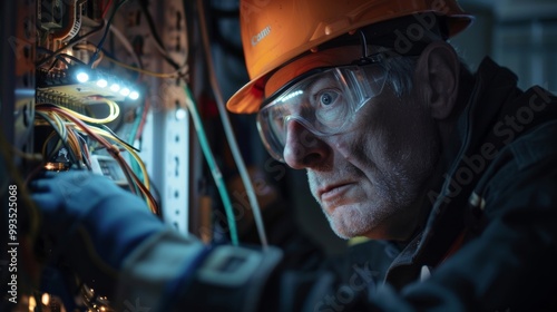 Focused Electrician Working on Complex Wiring with Safety Gear and Tools