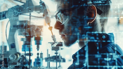 Focused engineer working with high-tech machinery in a futuristic industrial setting.
