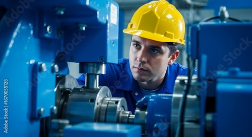 Focused factory worker examines a complex industrial machine.