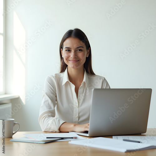 Focused Female Professional: A poised female professional is seated at her desk, a laptop at her fingertips, radiating confidence and capability. Her environment whispers of productivity and focus.