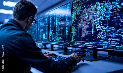 Focused individual analyzes complex data on multiple screens in a modern control room, emphasizing technology and cybersecurity.