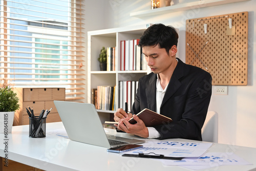 Focused male entrepreneur writing his strategy ideas on notebook and using laptop at working desk