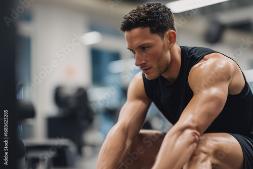 Focused man in the gym preparing for a workout. The photo captures the man's determined expression and muscular physique in a fitness setting