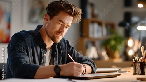 Focused Man Writing Creatively at a Desk in a Contemporary Home Office Environment