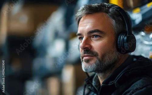 Focused Middle-Aged Man Wearing Headphones in Industrial Warehouse Setting, Deep in Thought, Contemplating Logistics and Supply Chain Management