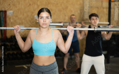 Focused motivated sporty young girl performing set of exercises with barbell during intense group workout. Concept of weight training ..
