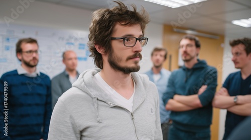Focused on the Task: A group of focused colleagues gathered in a modern office environment, their expressions a testament to dedication and cooperation.