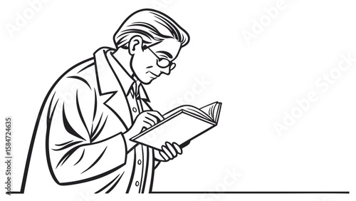 Focused Professional Reading Book - Black & White Line Art Illustration of Study and Knowledge