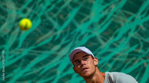 Focused Serve. A tennis player in action, serving the ball against a vibrant green backdrop.