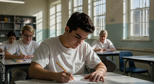 Focused Students Taking an Exam in a Bright Classroom