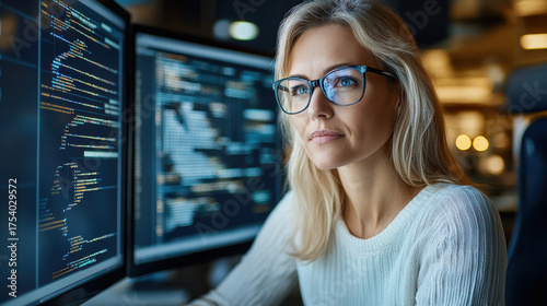 Focused woman programming with dual monitors displaying code and data analysis