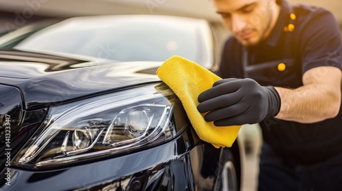 Focused Worker Polishing a Car with Yellow Cloth