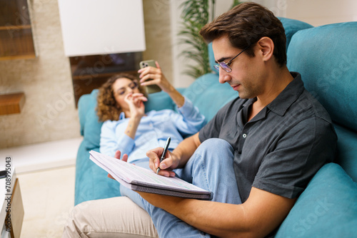 Focused young husband taking notes in notebook while sitting with wife on sofa
