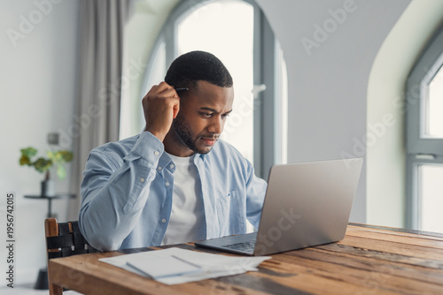 Focused young man working on laptop in bright home office, remote work and online study at wooden table