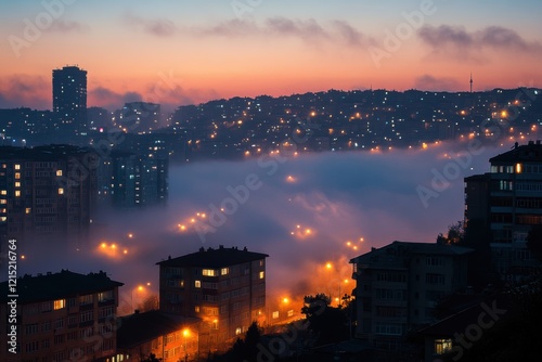 Fog envelops a bustling city as night falls, revealing glowing lights and a serene skyline