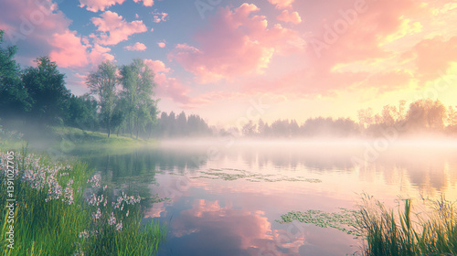 Fog rolling over a mirror-like pond, soft pastel sky