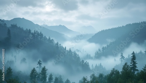 Foggy landscape, dense fog in the valley of the mountain range, pine trees on the mountainside, a cold blue color palette.