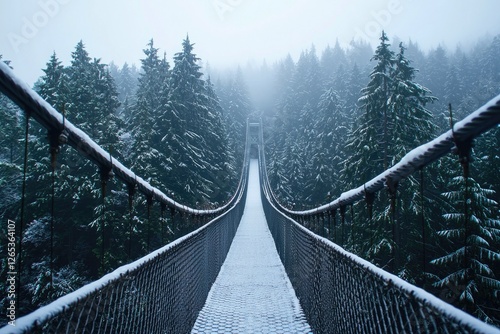 Foggy Winter Landscape with Snow-Covered Bridge