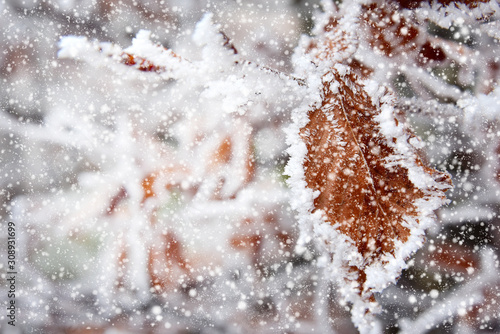 Foglie con neve e brina