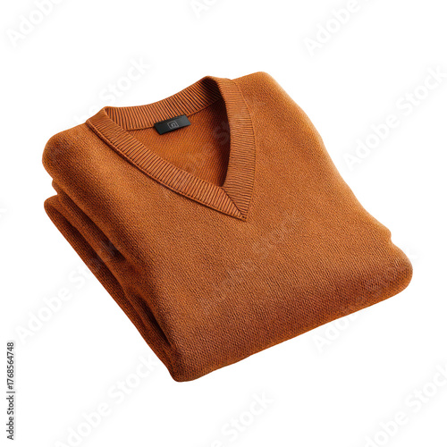 Folded orange v neck sweater with textured knit pattern isolated on transparent background