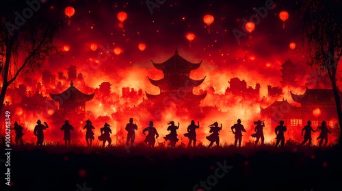 Folk dancers in vibrant costumes performing in front of a temple, surrounded by cultural exhibits and food stalls in vector papercut style