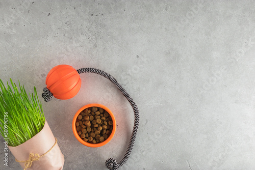 Food for cats or dogs in a bowl. Accessories on a light background. Useful herb, tasty and healthy animal food. Top view. Copy space.