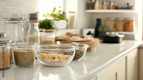 Food ingredients in jars and bowls on a clean, light countertop in a kitchen.