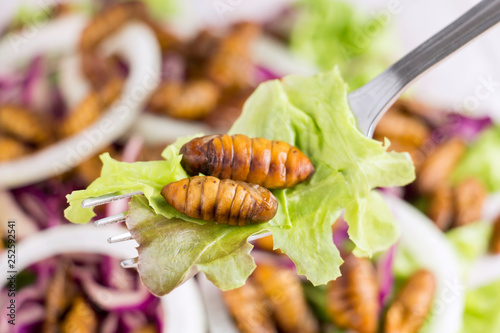 Food Insects: Worm insect or Chrysalis Silkworm fried for eating as food items on fork and in salad vegetable, it is good source rich of protein edible for future. Entomophagy concept.
