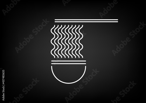 Food logo. White line art of noodle with bowl and chopstick illustration on black background.