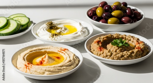 Food: Mediterranean Appetizer Dips Olives and Cucumber Isolated on White Background