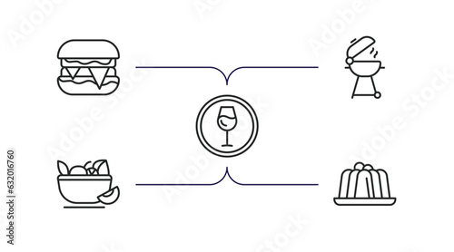 food outline icons set. thin line icons such as hamburguer, grill, drinking zone, vitamins, jelly vector.