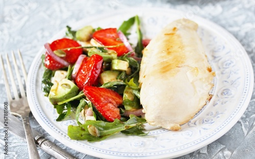 food without carbohydrates - fried chicken breast and salad with strawberries, cheese, avocados, onions and herbs, dressed with oil and balsamic. keto diet. rich in proteins. lunch for keto.
