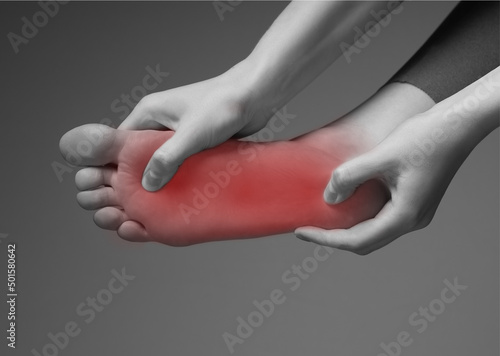 Foot pain. Woman hands holding leg with red point. Black and white. Inflammation, injury, chronic diseases consequences. Health problems concept. High quality photo